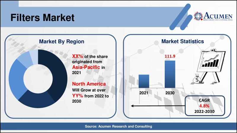 The Global Filters Market Size accounted for USD 74.6 Billion in 2021 and is estimated to achieve a market size of USD 111.9 Billion by 2030 growing at a CAGR of 4.8% from 2022 to 2030.Request For Free Sample Report @ https://www.acumenresearchandconsulting.com/request-sample/2599