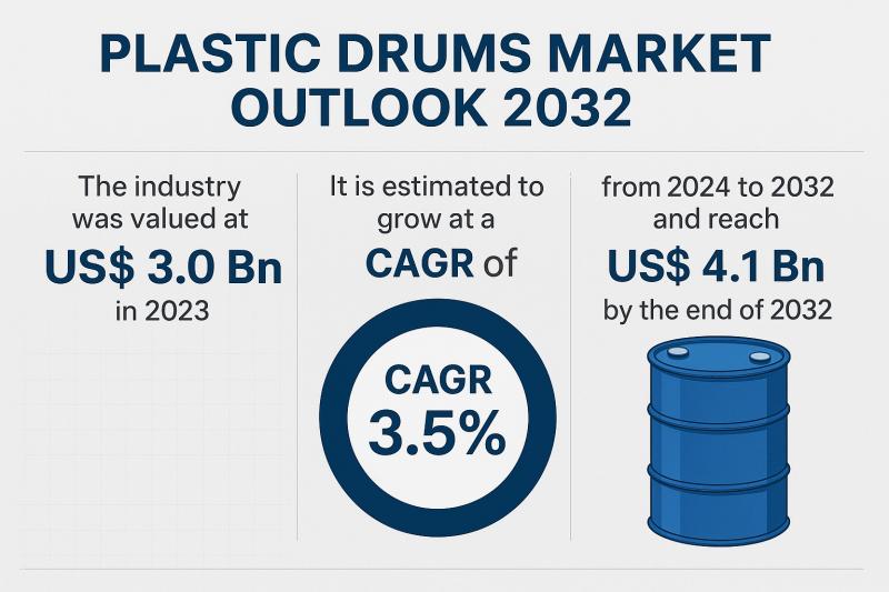 The global Plastic Drums Market, valued at US$ 3.0 Bn in 2023, is projected to reach US$ 4.1 Bn by 2032, expanding at a CAGR of 3.5% from 2024-2032, according to the latest market intelligence report. The expanding demand for lightweight, durable, and cost-efficient packaging solutions, coupled with accelerating growth in intercontinental trade, is creating strong growth momentum for plastic drum manufacturers worldwide.