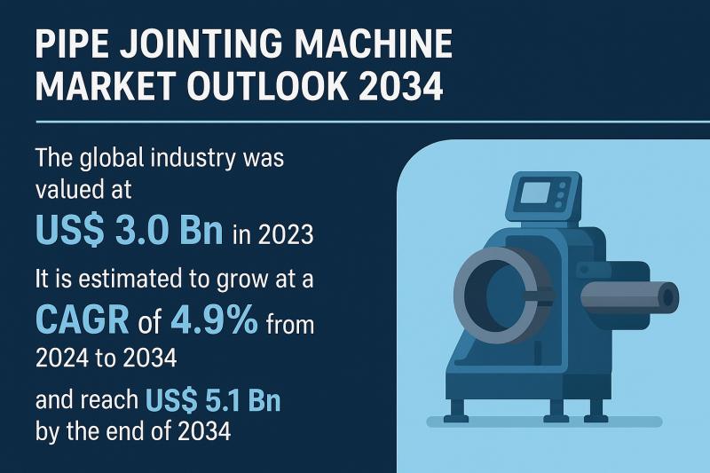 The global Pipe Jointing Machine Market is poised for steady growth as governments, municipal bodies, and industrial sectors worldwide increasingly prioritize efficient pipeline systems, water conservation, and reliable energy transportation. According to recent market analysis, the industry-valued at US$ 3.0 billion in 2023-is projected to reach US$ 5.1 billion by 2034, expanding at a CAGR of 4.9% between 2024 and 2034.