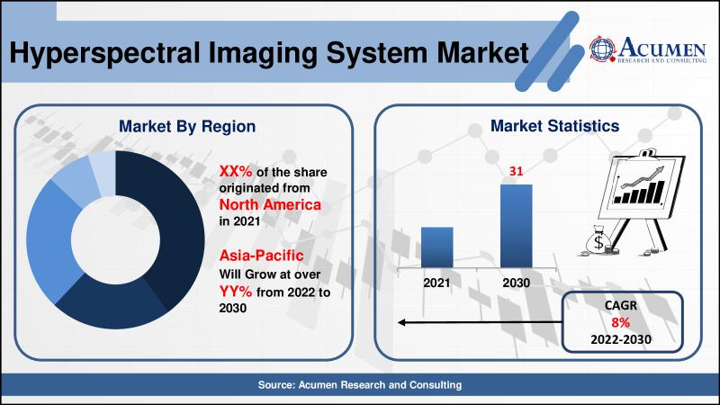 The Global Hyperspectral Imaging System Market Size accounted for USD 13.4 Billion in 2021 and is projected to occupy a market size of USD 55.8 Billion by 2030 growing at a CAGR of 17.3% from 2022 to 2030.Request For Free Sample Report @ https://www.acumenresearchandconsulting.com/request-sample/1133