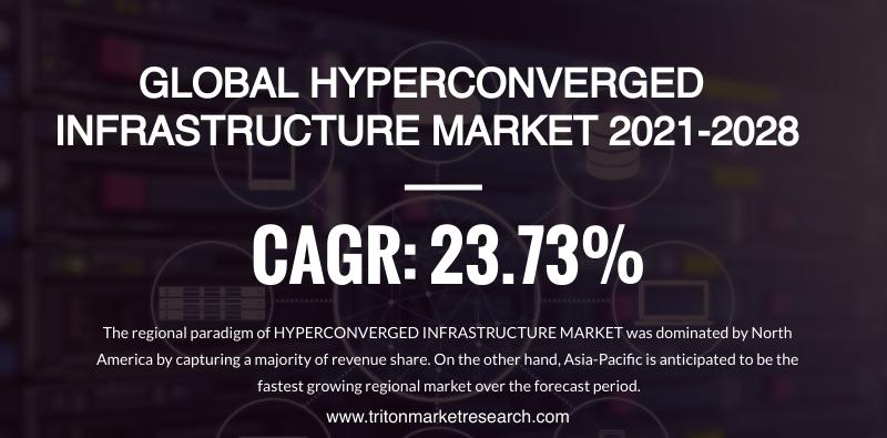 Triton Market Research presents the Global Hyperconverged Infrastructure Market segmented by End-user (Data Center Consolidation, Virtualizing Critical Applications, Remote Office/ Branch Office, Backup Recovery/ Disaster Recovery, Virtualization Desktop Infrastructure, Others), Industry Vertical (Healthcare, Education, IT & Telecommunications, Banking Finance & Service Industry, Energy & Utilities, Government, Manufacturing, Others), Components (Software, Hardware), and by Geography (North America, Asia-Pacific, Europe, Latin America, Middle East and Africa). It also discusses the Market Summary, Industry Outlook, Impact of COVID-19, Key Insights, Porter's Five Forces Analysis, Market Attractiveness Matrix, Vendor Scorecard, Key Market Strategies, Drivers, Challenges, Opportunities, Competitive Landscape, Methodology & Scope, Global Market Size, Forecasts & Analysis (2021-2028).Based on Triton's estimates, the global hyperconverged infrastructure market is likely to witness growth at a CAGR of 23.73% over the forecasted period 2021-2028.