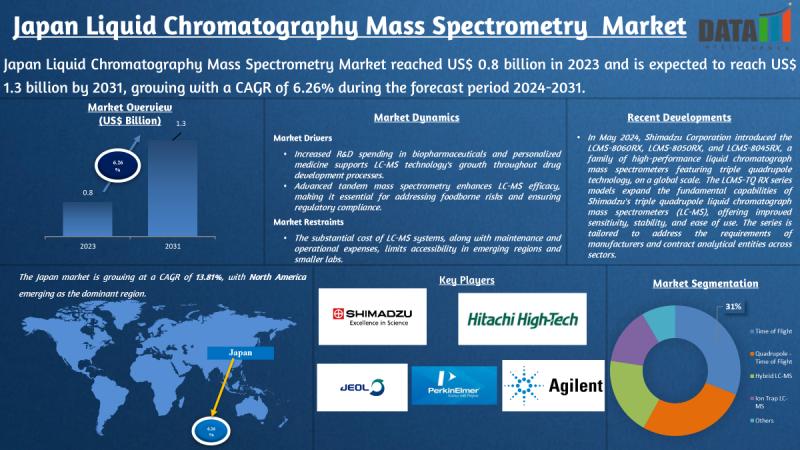 The Japan Liquid Chromatography Mass Spectrometry Market size reached US$0.8 billion in 2023 and is expected to reach US$1.3 billion by 2031, growing with a CAGR of 6.26% during the forecast period 2024-2031.