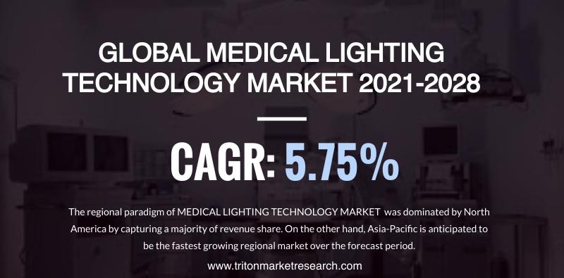 Triton Market Research presents the Global Medical Lighting Technologies Market segmented by Product (Incandescent and Halogen, LED, Fluorescent lighting technologies, Other Products), Type (Specialty Lighting, Surgical Lighting Systems [Wall-Mounted, Ceiling-Mounted, Mobile, Headlights, Other Surgical Lighting Systems], Accessories, Examination Lighting Systems [Floor-standing, Mobile, Rail-mounted, Wall-Mounted, Ceiling-Mounted, Tabletop, Other Examination Lighting Systems]), Application (Examination Rooms, Operating Rooms/Surgical Suites, ICU, Other Applications), and by Geography (North America, Middle East and Africa, Asia-Pacific, Europe, Latin America). It further discusses the Market Summary, Industry Outlook, Impact of COVID-19, Key Insights, Porter's Five Forces Model, Market Attractiveness Matrix, Vendor Scorecard, Key Market Strategies, Drivers, Challenges, Opportunities, Competitive Landscape, Research Methodology & Scope, Global Market Size, Forecasts & Analysis (2021-2028).Triton's research report insinuates that the global medical lighting technologies market is anticipated to advance at a CAGR of 5.75% during the evaluated years 2021-2028.