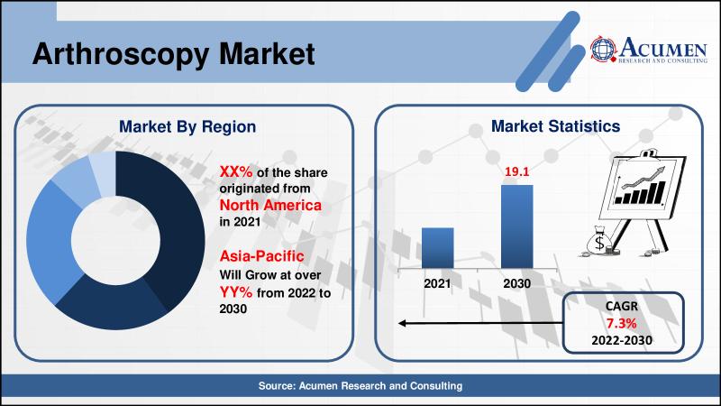 The Global Arthroscopy Market is expected to grow at a CAGR of around 7.3% from 2022 to 2030 and reach the market value of over US$ 19.1 Billion by 2030.North America is dominating region for arthroscopy market followed by Europe. This is attributed to high prevalence of joint related disorders highly integrating cases related to osteoarthritis, sports injuries, joint related disorders, and others. Such factors bolster the growth of arthroscopy market in North America. On the other hand, Asia Pacific will also gain a significant pace in the forthcoming years by recording a remarkable CAGR till the forecast period. This is highly supported by technological advancements through introduction of new products in the market. This highly supports the growth of APAC market for arthroscopy.