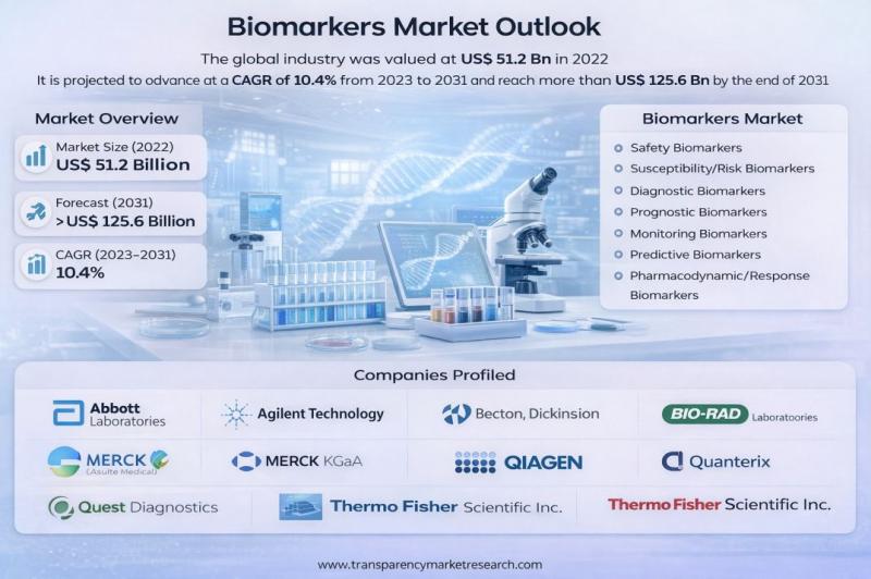 The global biomarkers market was valued at US$ 51.2 Billion in 2022 and is projected to expand at a robust CAGR of 10.4% from 2023 to 2031, reaching more than US$ 125.6 Billion by the end of 2031. This strong growth trajectory is driven by the rising prevalence of chronic diseases, increasing adoption of personalized medicine, rapid technological advancements in diagnostics, and expanding applications of biomarkers across healthcare and lifeโฆ
