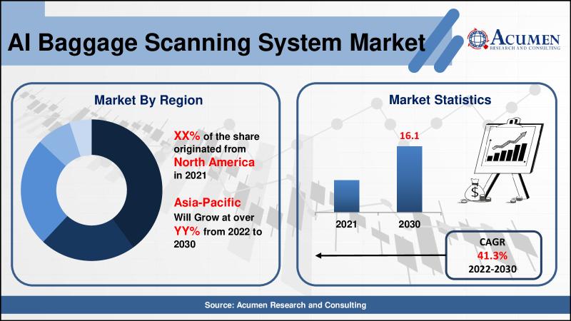 The Global AI Baggage Scanning System Market is expected to grow at a CAGR of around 41.3% from 2022 to 2030 and reach the market value of over US$ 16.1 Billion by 2030.The global AI baggage scanning system market is anticipated to exhibit the fastest growth over the forecast period from 2022 to 2030. The enhancing applicability in the sectors like airports, railways, marine, educational institutes, and border checkpoints, particularly in developed and developing economies is contributing to the market growth.