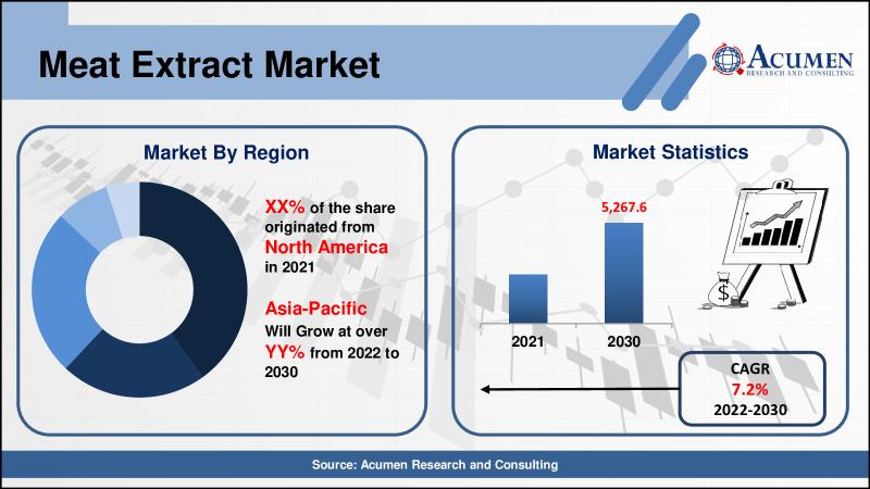 The Global Meat Extract Market is expected to grow at a CAGR of around 7.2% from 2022 to 2030 and reach the market value of over US$ 5,267.6 Million by 2030.North America has dominated the meat extract market in the past and will continue to do so during the forecast period. North America has traditionally been an appealing meat extract market, with the majority of consumers leading demanding lifestyles and seeking ready-to-eat meals. Furthermore, incorporating advanced technology to ensure the purity of the meat extraction process is an important part of meeting consumer demand. Additionally, the presence of prominent players is one of the major factors driving the growth of the meat extract market.