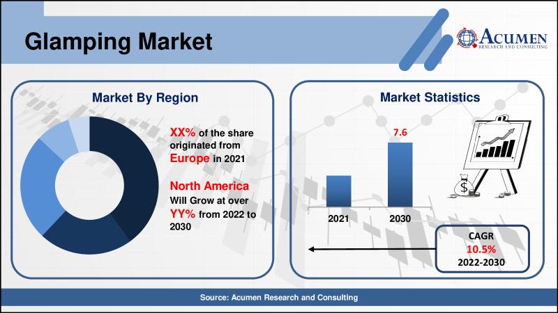 The Global Glamping Market is expected to grow at a CAGR of around 10.5% from 2022 to 2030 and reach the market value of over US$ 7.6 Billion by 2030.Europe is expected to dominate the glamping market during the forecast period. This is attributed to European vacationers who have been attempting to give glamping a whole new face by offering people the experience of a hotel among nature. With 8,000 campsites across the country, France is one of the key countries that promote glamping for its people, ranking second only to the United States. The first five-star glamping site in France opened in 2010, but in the decade since, investors has been collaborating with camping companies to expand the country's glamping business. France now has 221 five-star campsites and 1,171 four-star glamping sites spread throughout the country.
