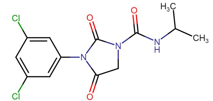 Iprodione is a colorless, odorless crystal, soluble in water and other solvents such as methanol, ethanol, toluene, acetonitrile, acetone, benzene and dimethylformamide. Iprodione is a nematicide and hydantoin fungicide used in the agricultural industry in many parts of the world. Trade names for commercial products containing iprodione include DOP 500F, Chipco 26019, Kidan, NRC 910, LFA 2043, Rovral and Verisan. Iprodione is used in formulations with a variety of other fungicides including thiabendazole and carbendazim. Also, iprodione is compatible with most other insecticides. Iprodione is used on crops affected by Botrytis matsutake, Sclerotinia brown rot and other fungal diseases of plants. Iprodione is currently applied to a variety of crops and lawns such as fruits, ornamental trees, vegetables and scrubs.
