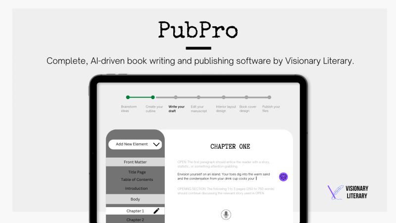 PubPro is an app under development by Visionary Literary, a rapidly growing media company helping turn aspiring authors into published authors. The company offers multiple service options, including one-on-one support, coaching, and an on-demand online course.