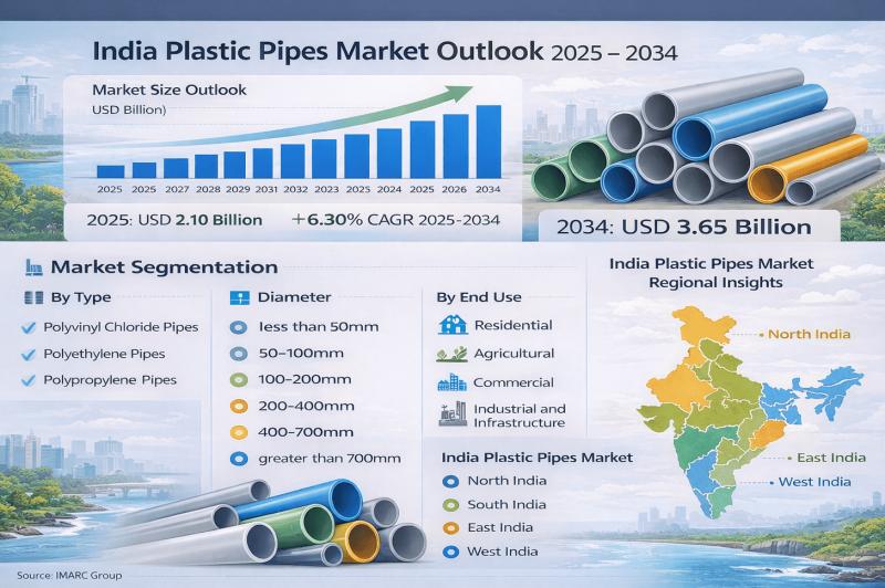 According to IMARC Group's report titled "India Plastic Pipes Market Size, Share, Trends and Forecast by Type, Diameter, End Use, and Region, 2026-2034" the report offers a comprehensive analysis of the industry, including market share, growth, trends, and regional insights.