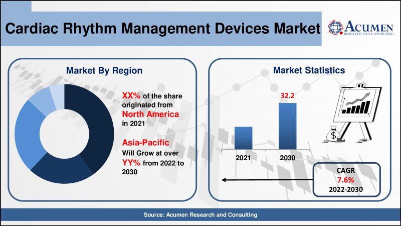 The Global Cardiac Rhythm Management Devices Market is expected to grow at a CAGR of around 7.6% from 2022 to 2030 and reach the market value of over US$ 32.2 Billion by 2030.The global cardiac rhythm management devices market is expected to be dominated by North America. This expansion is due to a variety of factors, including well-established healthcare infrastructure, an ageing population, rapid adoption of technologically advanced products (such as long battery life, biocompatible materials or miniaturization, and leadless), and increased regulatory scrutiny. Many companies are currently working on new devices based on existing pacemaker and implantable cardioverter defibrillator (ICD) technologies.