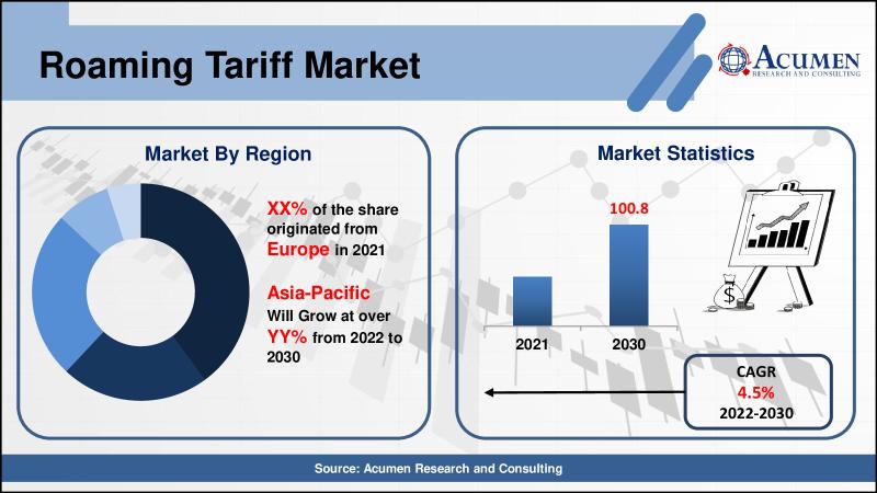 The Global Roaming Tariff Market is expected to grow at a CAGR of around 4.5% from 2022 to 2030 and expected to reach around US$ 100.8 Billion by 2030.Europe currently holds the lion's share of the roaming tariff market, with a reasonable share, and will maintain this dominance throughout the forecast period. According to the EU report, the most important factor contributing to market growth is fair use policy. When roaming within the EU, mobile operators may implement a "fair use policy" to ensure that all roaming customers have access to and benefit from the "roam like at home" rules (roaming services at domestic prices). Apart from that, UK carrier EE has implemented roaming tariffs for customers travelling to nearly all EU countries. Roaming tariffs for UK customers visiting mainland Europe were common until the EU exited the market in 2017. Currently, EE's decision makes it the first UK carrier to implement post-Brexit roaming tariffs. This allows EE users from UK to enjoy unlimited roaming in Europe and beyond, and there are no plans to change it as a result of the Brexit outcome. These factors have a positive impact on the growth of the roaming tariff market.