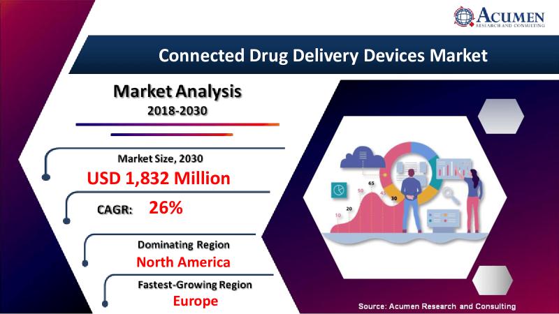 The global connected drug delivery devices market size is expected to be around USD 1,832 Billion by 2030, the market is projected to grow with 26% CAGR during the forecast timeframe. Supportive government regulation to encourage the adoption of advance healthcare infrastructure is expected to bolster the global connected drug delivery devices market growth.DOWNLOAD SAMPLE PAGES@ https://www.acumenresearchandconsulting.com/request-sample/910