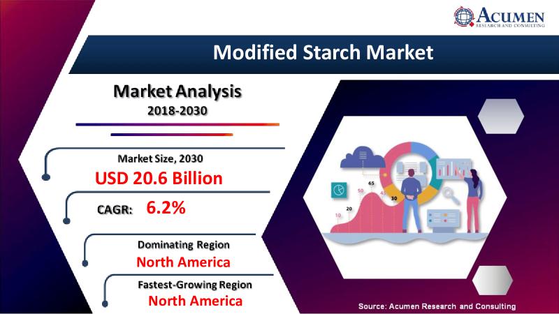 The global Modified starch market size is anticipated to around USD 20.6 Bbillion by 2030, this market is anticipated to grow with 6.2% CAGR during the forecast time period. Increasing need for convenience food and speedily merging pharmaceutical industry in APAC region are expected to drive modified starch market growth across the global.Favourable government policies in agriculture trade sponsoring usage of modified starch products and attractive investments have shaped new development opportunities in APAC region. Nations such as China, India, South Korea, Japan, and Taiwan depend on agriculture to some extent for economic development on account of it being a major contributor to their GDP, which drive the growth of the market in coming years.