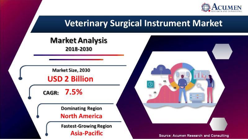 The global Veterinary surgical instrument market size is anticipated to reach around USD 2 Billion by 2030, this market is anticipated to grow with 7.5% CAGR during the forecast time period. Surge in the use of energy-efficient device is expected to drive the growth of the global veterinary surgical instrument market. Increasing numeral of veterinary surgical processes and growing pet acceptance are the main factors encouraging the veterinary surgical instrument market.Download Report Sample Pages For Better Understanding@ https://www.acumenresearchandconsulting.com/request-sample/950