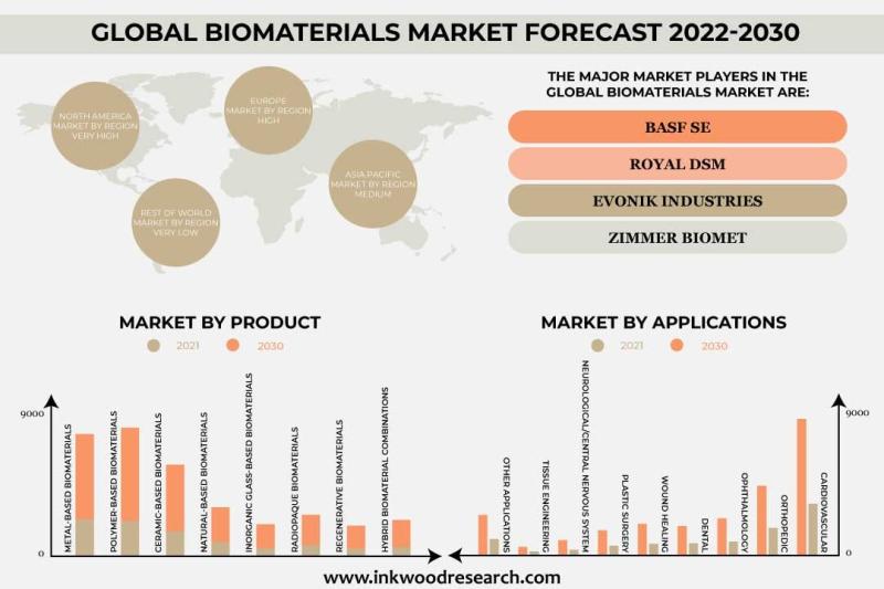 According to Inkwood Research, the global biomaterials market is expected to surge with a CAGR of 12.78% during the forecast years between 2022 and 2030, and is projected to generate $269549.11 million in revenue by 2030.Browse 50 market data Tables and 133 Figures spread over 395 Pages, along with an in-depth analysis of the Global Biomaterials Market by Product, by Application & by Geography.