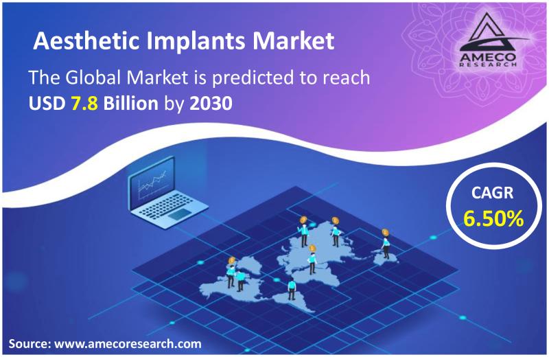 Global aesthetic implants market size is expected to be worth roughly USD 7.8 billion by 2030, growing at a CAGR of more than 6.5% during the projected timeframe of 2022-2030, according to Ameco ResearchRecent advancements in the cosmetic sector, combined with rising discretionary income, are accelerating the rate of acceptance of aesthetic implants. With recent breakthroughs leading to increased use of cosmetic operations including aesthetic implants, there has also been a rise in the variety of cosmetic procedures accessible for men.