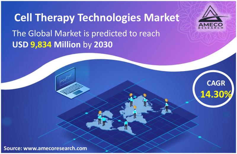 Global cell therapy technologies market is expected to be worth roughly USD 9,834 million by 2030, growing at a CAGR of more than 14.3% during the projected timeframe of 2022-2030, according to Ameco ResearchOver the last few years, there has been significant progress in defining the range and quantity of acceptable cell types for external administration. It is significant to observe that all these cells have proven beneficial healing capacities in animal-based trials for a broad spectrum of health issues. Cell suspensions are injected into the circulation, a tissue, or an organism in the procedure of cell therapy, with the hope that these cells will aid in the treatment of any lesion. Organizations in the cell therapy technologies market globally are expanding and focusing on research and innovation. Aside from that, they are observed engaging in various strategic activities such as acquisitions and mergers. One of the primary motivations for these tactics is to expand their current cell treatment repertoire. Aside from that, some businesses are increasing their investments in the introduction of unique manufacturing procedure locations. All of these actions add up to a potential expansion of the cell therapy technologies market globally in the next years.