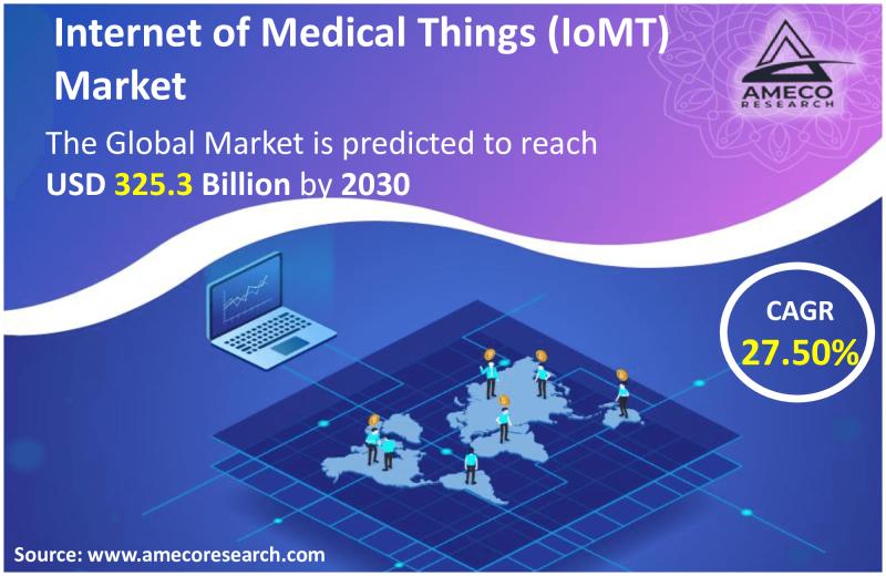 Global Internet of Medical Things (IoMT) market size is expected to be worth roughly USD 325.3 billion by 2030, growing at a CAGR of more than 27.5% during the projected timeframe of 2022-2030, according to Ameco ResearchThe Internet of Medical Things (IoMT), a system of integrated hospital devices, software programs, healthcare systems, as well as services, is rapidly transforming the role of medical technology in the healthcare industry. Medical organizations are modifying healthcare in novel ways by using medical equipment and gadgets via the Internet of medical things (IoMT). Integrated gadgets such as ECG monitors, glucose monitors, pulse oximeters, as well as blood pressure monitors are positioned close to a patient's body and ensure enhanced customer satisfaction by providing round-the-clock medical care and services.