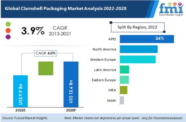 Clamshell packaging, also known as blister packaging, is a type of packaging that consists of a clear plastic blister that is sealed onto a card. The blister can hold a product, such as a toy or small electronic device, and the card provides space for branding and product information.The clamshell packaging market is estimated at US$ 9.9 Bn in 2022 and is projected to reach US$ 12.6 Bn by 2028, at a CAGR of 4% from 2022 to 2028.