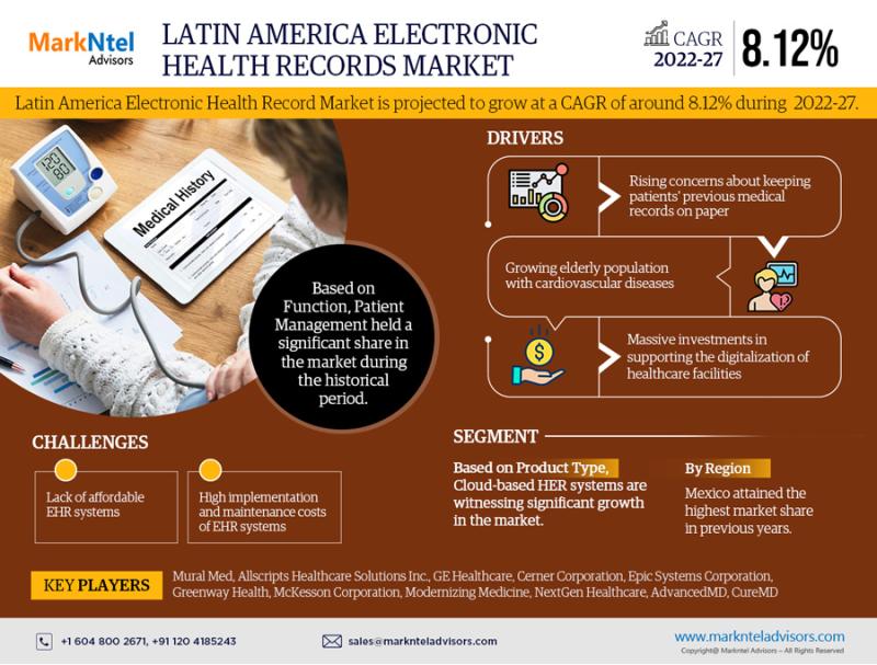 The Latin America Electronic Health Record Market Analysis, 2022, by MarkNtel Advisors presents a well-researched, detail-driven, and accurate study for the stakeholders. This analysis entails prominent aspects like trends, & recent developments, drivers, opportunities, challenges, & restraints, among other parameters, influencing the overall industry expansion across Latin America.According to Latin America Electronic Health Records Market Research Report: Forecast (2022-2027), "The Latin America Electronic Health Record market is projected to grow at a CAGR of around 8.12% during the forecast period, i.e., 2022-2027, owing to the benefits of EHR, such as storing patients' medical history, diagnosis, immunization dates, laboratory test results, etc., on a digital platform.