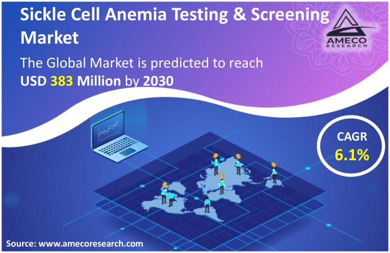 Global Sickle Cell Anemia Testing & Screening Market size is expected to be worth roughly USD 383 Million by 2030, growing at a CAGR of more than 6.1% during the projected timeframe of 2022-2030, according to Ameco ResearchIn recent years, as new technologies and therapies have been developed, the market for testing and screening for sickle cell anemia has evolved. Some of the significant trends in this market are the rising use of genetic analysis and screening technologies to identify sickle cell anemia, such as PCR-based testing and Next-Generation Sequencing (NGS). Furthermore, there are increasing demands for point-of-care (POC) testing kits for sickle cell anemia, which allow for rapid and reliable diagnosis in contexts where traditional laboratory testing is not possible. This is especially significant in developing nations where healthcare is scarce. Another significant market trend is the development of new medicines for sickle cell anemia, such as gene therapies and stem cell therapies. These treatments have the potential to greatly enhance the lives of patients suffering from the illness and are expected to drive the sickle cell anemia testing & screening market value.