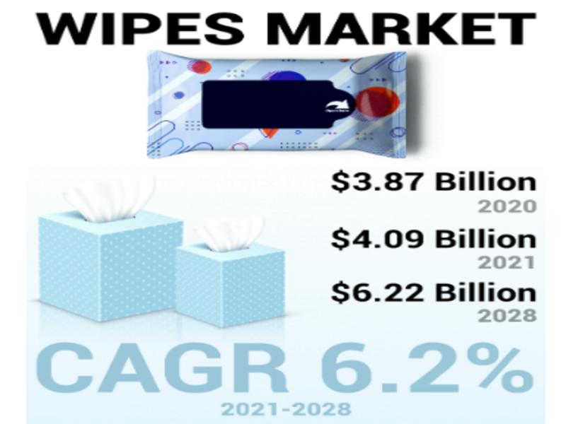 The global wipes market size was USD 3.87 billion in 2020. The market is projected to grow from USD 4.09 billion in 2021 to USD 6.22 billion in 2028 at a CAGR of 6.2% in the 2021-2028 period.This information is provided by Fortune Business Insights™, in its report, titled, "Wipes Market Size, Share & COVID-19 Impact Analysis, By Application (Personal Care, Household, Industrial), Type (Disposable and Non-disposable), Distribution Channel (Supermarkets /Hypermarkets, Convenience Stores, Specialty Stores, Online Channels, and Others), and Regional Forecast, 2021-2028."