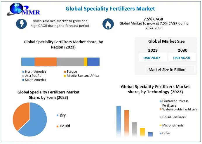 specialty fertilizers market size was valued at USD 28.07 Bn. in 2023 and is expected to reach USD 46.58 Bn. by 2030, at a CAGR of 7.5%.