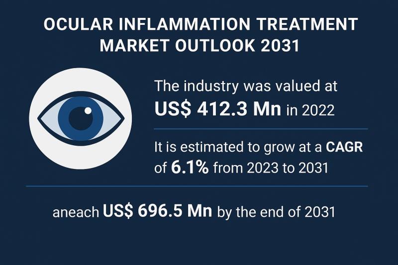 The global Ocular Inflammation Treatment Market is witnessing sustained growth driven by rising environmental challenges, increasing prevalence of optical infections, and strong advancements in ophthalmic drug development. As per recent industry assessments, the market-valued at US$ 412.3 Mn in 2022-is projected to expand at a CAGR of 6.1% from 2023 to 2031, reaching US$ 696.5 Mn by the end of 2031.