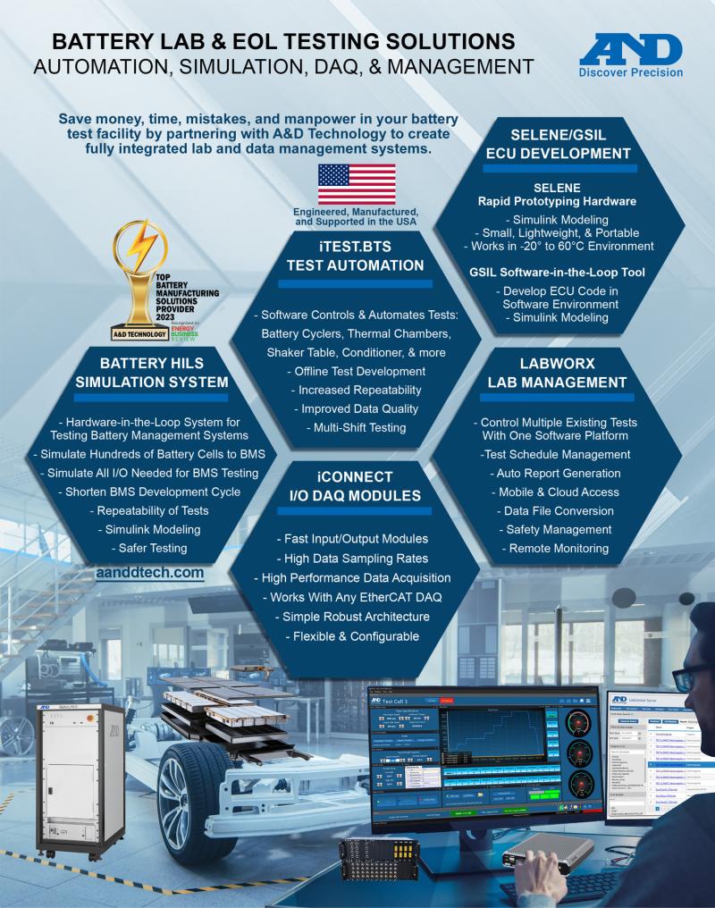 ANN ARBOR, MICHIGAN - A&D Technology, a leading provider of advanced testing and measurement solutions, has been recognized by Energy Business Review Magazine as one of the Top Ten Battery Manufacturing Solutions Providers for 2023. This prestigious award recognizes A&D Technology's commitment to innovation and excellence in the battery manufacturing industry.A&D Technology has been at the forefront of the automotive testing and development industry for decades, providing advanced testing and measurement solutions to battery manufacturers around the world. The company's comprehensive suite of products and services includes battery test simulation, automation, management, and data analysis, helping manufacturers optimize their battery R&D, production, or end of line testing processes and improve the performance and reliability of their products.