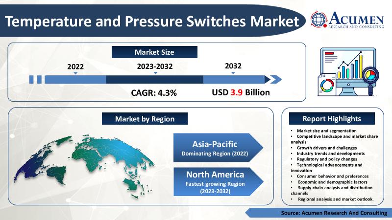 The Temperature and Pressure Switches Market report provides a comprehensive analysis of the global market, taking into consideration its history, current scenario, and future development trends. It also examines market aspects such as trends, share, forecast, outlook, production, and future growth potential. The report also details various new trends and technologies that are being adopted by the various players in the Temperature and Pressure Switches Market to propel their business in a positive direction. The report also highlights business dynamics such as profitability, product knowledge, revenue, industry growth, end users, etc. to provide the client with additional data regarding the Temperature and Pressure Switches Market. The market report gives historical numbers from 2020 to 2022 and stretches the forecast period from 2023 to 2032.Temperature and Pressure Switches Market Report Highlights