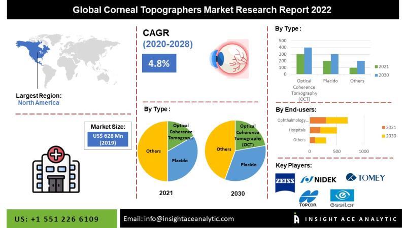 Insightace Analytics Pvt. Ltd. announces the release of a market assessment report on the "Global Corneal Topographers Market- by Product (Optical Coherence Tomography (OCT), Placido, Scheimpflug, Ray Tracing, LED Triangulation and Others), End-User (Hospitals, Ophthalmology Clinics, Ambulatory Surgical Centers and Others), Trends, Industry Competition Analysis, Revenue and Forecast To 2030."Request for Sample Pages: https://www.insightaceanalytic.com/request-sample/1159