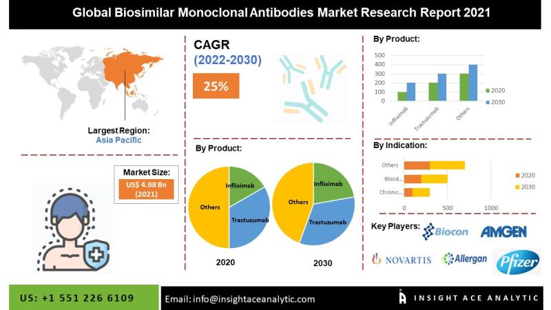 InsightAce Analytic Pvt. Ltd. announces the release of a market assessment report on the "Global Biosimilar Monoclonal Antibodies Market- by Product (Infliximab, Trastuzumab, Rituximab, Adalimumab, Bevacizumab, Cetuximab, Ranibizumab, Denosumab, Eculizumab and Other Pipeline Products), Indication (Oncology, Inflammatory & Autoimmune Disorders, Chronic Diseases, Blood Disorders and Other Indication), Trends, Industry Competition Analysis, Revenue and Forecast To 2030."Get Free Sample Copy of Report : https://www.insightaceanalytic.com/request-sample/1218