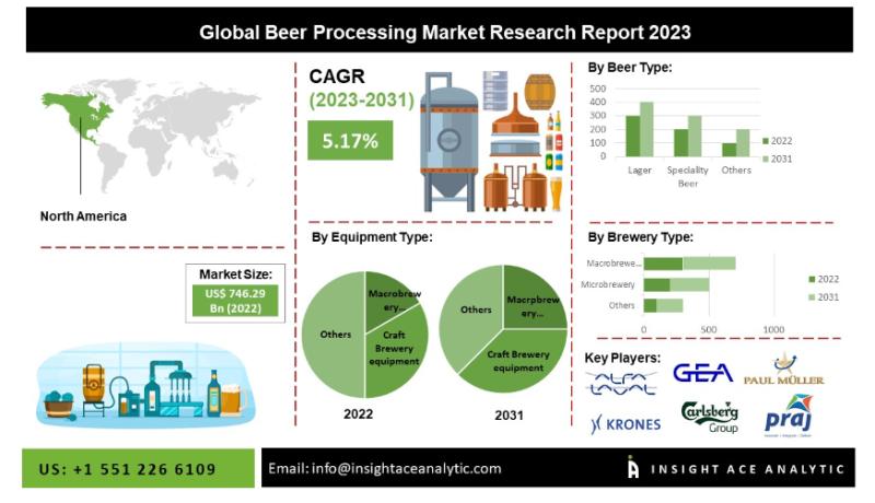 InsightAce Analytic Pvt. Ltd. announces the release of a market assessment report on the "Global Beer Processing Market Size, Share & Trends Analysis Report By Brewery Type (Macrobrewery, Craft Brewery, Microbrewery, Brewpub), Beer Type (Lager, Ale And Stout, Specialty Beer And Low Alcohol Beer), Equipment Type (Macrobrewery Equipment (Milling Equipment, Brewhouse (Mash Kettles, Lauter Tun, Wort Kettles, Whirlpoolers, Steam Generators, Others (Hot Liquor Tanks And Cold-Water Tanks, Laboratory Equipment, And Aeration Devices)) Cooling Equipment, Fermentation Equipment, Filtration & Filing Equipment) , Price Category (Mainstream, Discount, Premium And Super-Premium) And Distribution Channel (Off-Trade And On-Trade)- Market Outlook And Industry Analysis 2031"The global Beer Processing Market is estimated to reach over USD 1155.50 billion by 2031, exhibiting a CAGR of 5.17% during the forecast period.