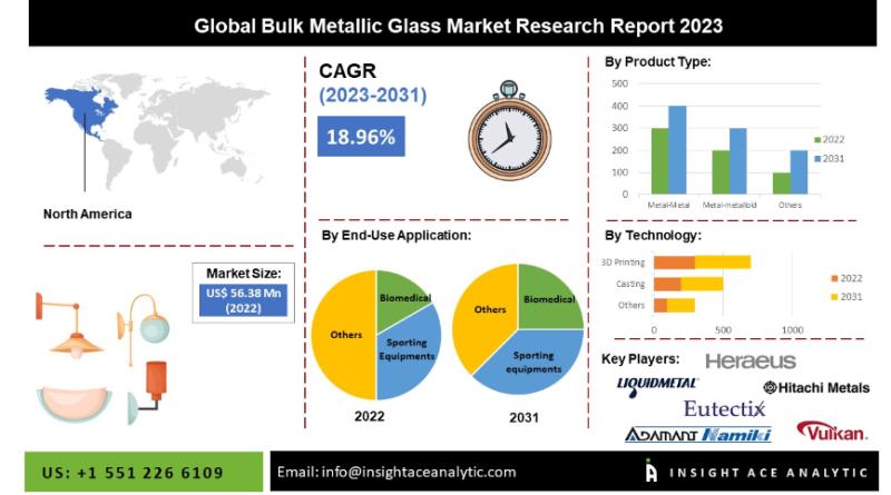 Insight Analytics Pvt. Ltd. announces the release of a market assessment report on the "Global Bulk Metallic Glass Market (By End Users (Consumer Electronics And Wearables, Biomedical, Sporting Equipment, Aerospace/Defense), Products (Metal-Metal And Metal-Metalloid) And Technology (Casting, Thermoplastic Forming And 3D Printing))- Market Outlook And Industry Analysis 2031"The global bulk metallic glass market is estimated to reach over USD 264.31 million by 2031, exhibiting a CAGR of 18.96% during the forecast period.