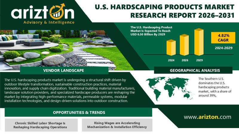 The U.S. hardscaping products market, valued at USD 4.90 billion in 2025, is expected to reach USD 6.50 billion by 2031, growing at a CAGR of 4.82%, according to recent research by Arizton. The market is gaining strategic importance within the broader construction and outdoor infrastructure landscape, driven by rising residential remodeling, expanding outdoor living trends, and increasing public infrastructure investments.