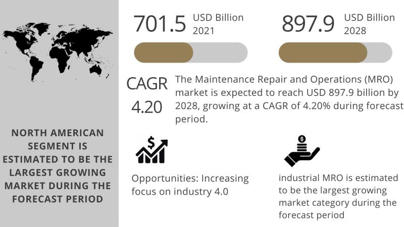 The report "Maintenance Repair and Operations (MRO) Market by MRO Type (Industrial MRO, Electrical MRO, Facility MRO, Others), Provider (Original Equipment Manufacturer (OEM), Aftermarket), End Use (Manufacturing, Construction, Electrical, Facility, Mining, Aerospace and Defense, Automotive, Food and Beverages, Pharmaceuticals, Chemicals, Oil and Gas, Others) Technology (3D Printing, AR/VR, Artificial Intelligence, Robotics, Big Data Analytics, Internet of Things (IoT), Predictive Maintenance, Others) Application (Predictive Analysis, Performance Monitoring, Inspection, Mobility and Functionality, Others) - Global Forecast to 2028" The maintenance repair and operations (MRO) market is projected to grow from USD 701.5 billion in 2021 and is projected to reach USD 897.9 billion by 2028; it is expected to grow at a CAGR of 4.20% from 2021 to 2028. The growing demand for increased organizational efficiency across industries is one of the key factors driving the market's rise. The rising use of professional services can also be attributed to MRO significantly enhancing supply chain management and process effectiveness. The market is growing due to the product's extensive use in manufacturing. MRO is utilized to keep track of the upkeep of industrial machinery, consumables, furniture, and plant supplies, as well as to stop cyclical swings in the machinery. Additionally, several technological advancements promote market expansion, such as linked devices with the artificial intelligence (AI), Internet of Things (IoT), and preventative maintenance solutions. Furthermore, the market is predicted to develop due to several other factors, including the major expansion of the e-commerce sector and the implementation of numerous government efforts to reduce overall energy usage and adopt lean manufacturing.Get Free Sample @ https://marketsnresearch.com/sample/1563