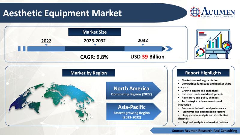 Global Aesthetic Equipment Market Size in 2022 was USD 39 Billion, Market Value set to reach USD 39 Billion at 9.8% CAGR by 2032Aesthetic Equipment Market Overview