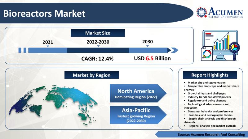 ● The global Bioreactors market size in 2021 stood at USD 2.3 Billion and is set to reach USD 6.5 Billion by 2030, growing at a CAGR of 12.4%