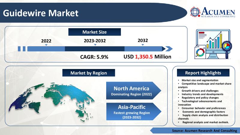 ● The global Guidewire market size in 2022 stood at USD 770.5 Million and is set to reach USD 1350.5 Million by 2032, growing at a CAGR of 5.9%