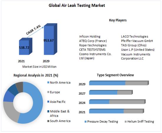 Pune, 31, March, 2023: Over the forecast period, Maximize market research expects, the market was valued at USD 538.72 Mn in 2021 and is expected to significantly grow at a CAGR of 7.4 percent over the forecast period to reach USD 953.67 Mn by 2029. The report analyzed by Maximize Market Research, on the "Air Leak Testing Market", covers an extensive regional analysis and competitive Landscape.Air Leak Testing Market Scope and Research Methodology: