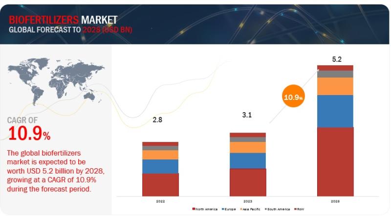 The global biofertilizers market is expected to experience a Compound Annual Growth Rate (CAGR) of 10.9% from 2023 to 2028, growing from USD 3.1 billion in 2023 to USD 5.2 billion in 2028.Download PDF Brochure: https://www.marketsandmarkets.com/pdfdownloadNew.asp?id=856