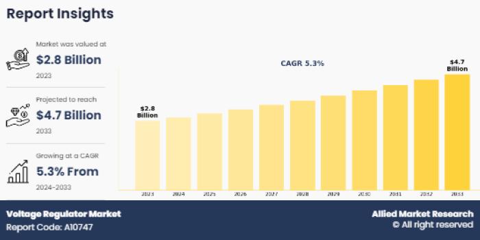 According to a new report published by Allied Market Research, the voltage regulator market was valued at $2.8 billion in 2023 and is projected to reach $4.7 billion by 2033, growing at a CAGR of 5.3% from 2024 to 2033. The steady growth of this market is attributed to increasing renewable energy integration, grid modernization initiatives, rising electrification, and expanding applications across residential, commercial, industrial, and automotive sectors.