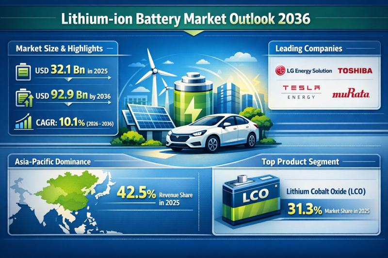 The global lithium-ion battery market was valued at US$ 32.1 billion in 2025 and is projected to reach US$ 92.9 billion by 2036, expanding at a compound annual growth rate (CAGR) of 10.1% from 2026 to 2036.
