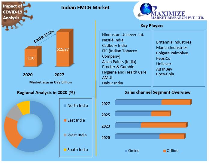 You can edit or delete your press release Indian FMCG Market size was valued at USD 110 Bn in 2020, and it is expected to reach USD 615.87 Bn by 2027 with a CAGR of 27.9% during the forecast period here