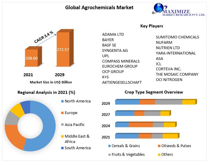 Global Agrochemicals Market is anticipated to reach US$ 272.57 Bn by 2029 from US$ 208.60 Bn. in 2021 at a CAGR of 3.4% during the forecast period