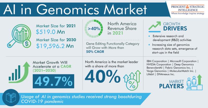 The total value of AI in the genomics market was USD 519.0 million in 2021, and it will rise at a growth rate of above 49.7% in the near future, to reach USD 19,596.2 million by 2030, according to P&S Intelligence.Browse full report at: https://www.psmarketresearch.com/market-analysis/ai-genomics-market