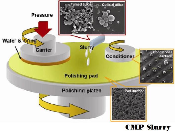 Chemical mechanical polishing/planarization (CMP) slurries are abrasive materials, also called non-crystalline inorganic oxides, which are dispersed in water blended with other chemicals and used in CMP processes for semiconductors. CMP process is employed in semiconductor manufacturing, where surfaces of wafers are smoothed and leveled with the help of abrasive slurries. This process is critical for precise lithography patterning, and is utilized after every deposition-etch step.