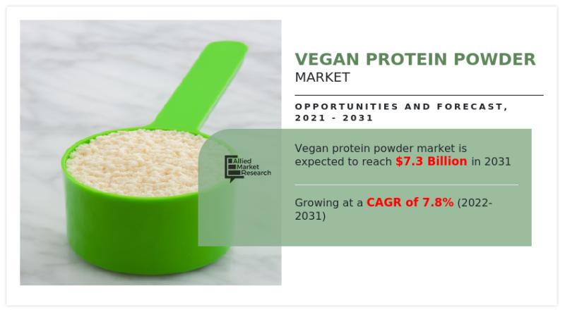 A new report published by Allied Market Research, titled, "Vegan Protein Powder Market," The vegan protein powder market size was valued at $3.5 billion in 2021, and is estimated to reach $7.3 billion by 2031, growing at a CAGR of 7.8% from 2022 to 2031.Players operating in the global vegan protein powder market have adopted various developmental strategies to expand their vegan protein powder share, increase profitability, and remain competitive in the market. The key players profiled in vegan protein powder industry report include Archon Vitamin LLC., Sequel Natural Ltd., Hormel Foods Corporation, Vital Amine, Inc., NOW Health Group, Inc., Nutiva Inc., General Nutrition Centers, Inc., True Nutrition, MusclePharm Corporation, Glanbia plc, Abbott Laboratories, GlaxoSmithKline Plc, ABH Pharma Inc., Suppleform, Vitaco Health, Amway Corporation, and Herbalife International of America Inc.